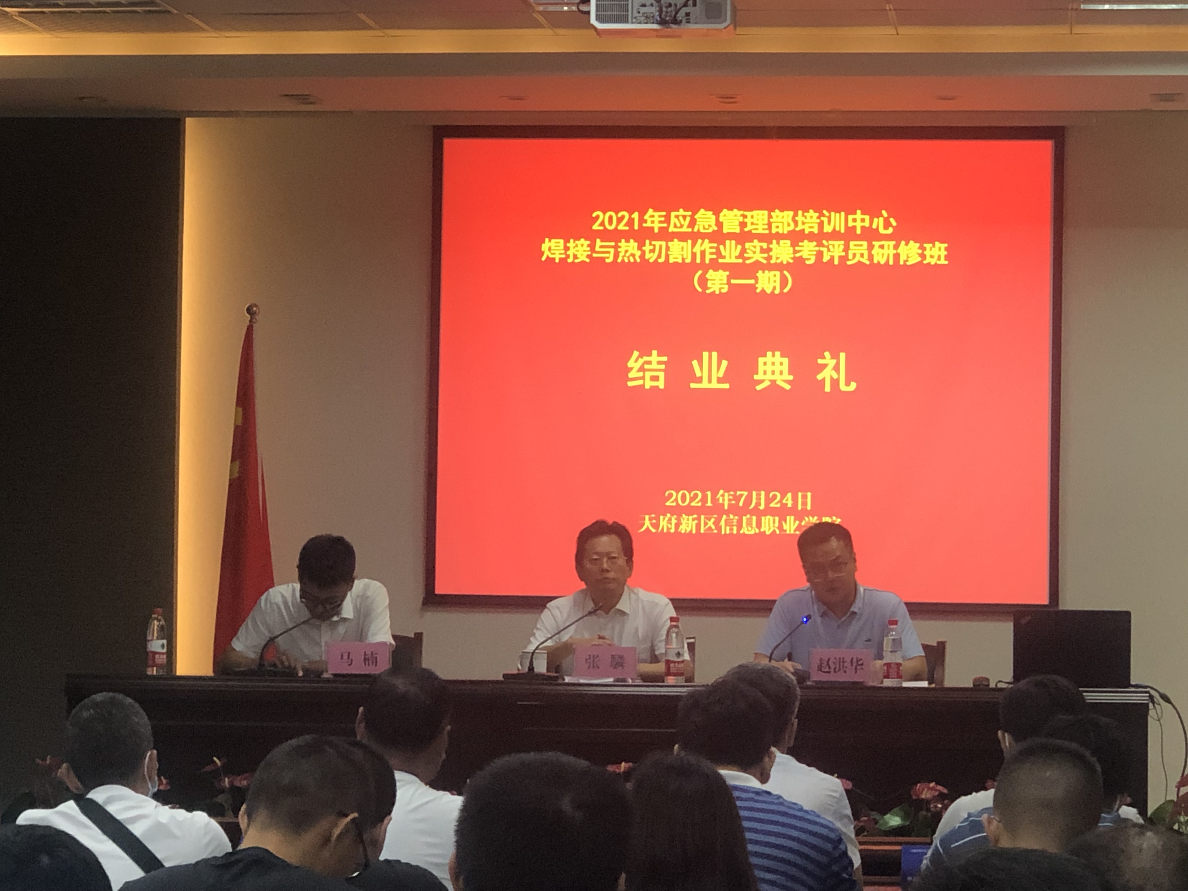 7月24日,2021年第一期全国焊接与热切割作业实操考评员研修班在四川天府新区信息职业学院圆满结束。应急管理部培训中心主任张驎巡查了结业考试并给予现场指导,他在结业典礼上指出,本次研修班的顺利举办,对进一步加强特种作业实操考评员队伍建设产生了积极的推动作用;他强调,要将培训成果带到实际工作中,有效提高特种作业实操考试水平,充分发挥考试的杠杆撬动作用。